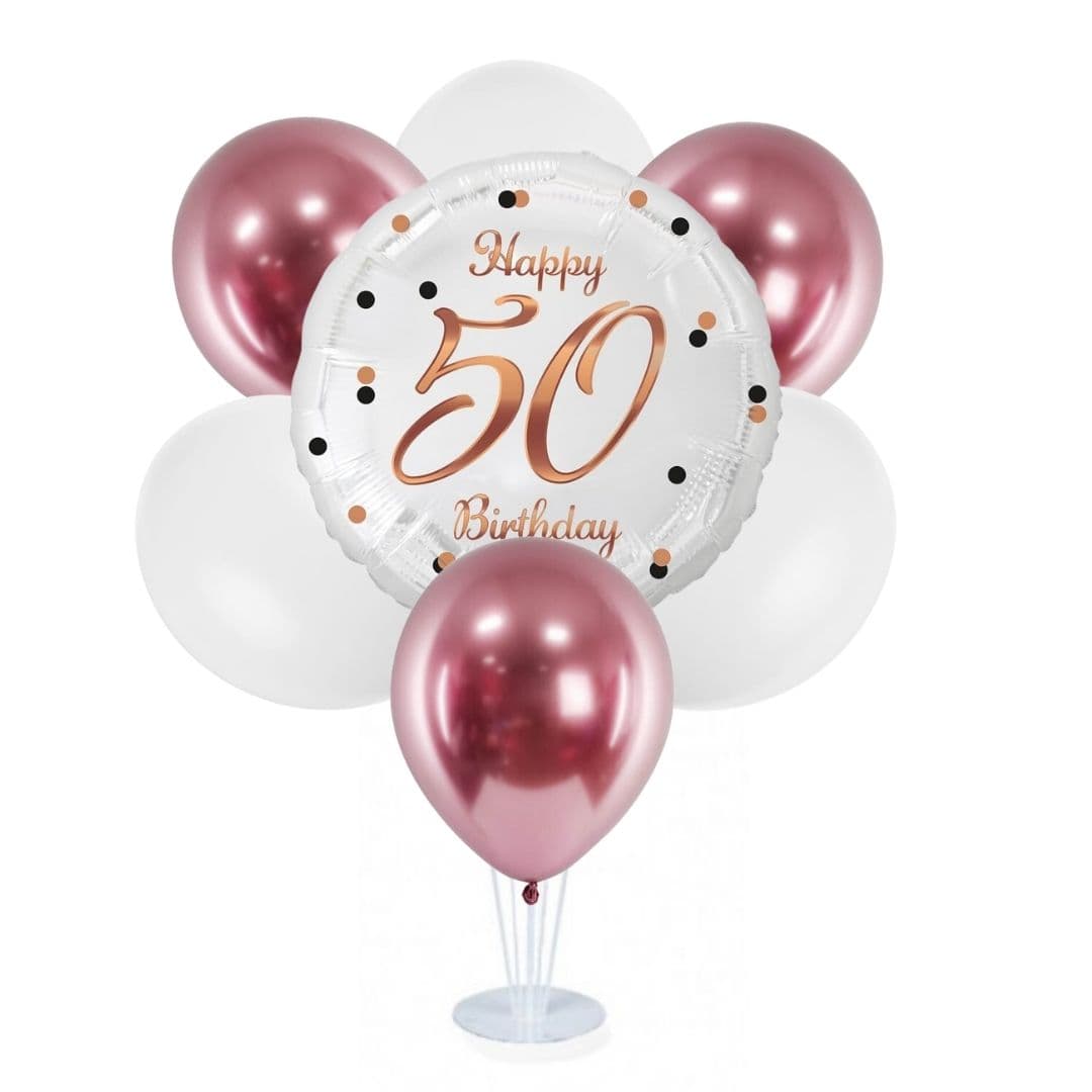 Balonowy zestaw na stojaku w kolorze bieli i różowego złota z centralnie umieszczonym balonem "Happy 50 Birthday" to elegancki dodatek i element aranżacji uroczystego dnia. Całość umieszczona jest na wytrzymałym stojaku, który zapewnia łatwą prezentację oraz stabilność dekoracji. To idealny wybór, by uczcić półwiecze życia w wyjątkowym stylu.