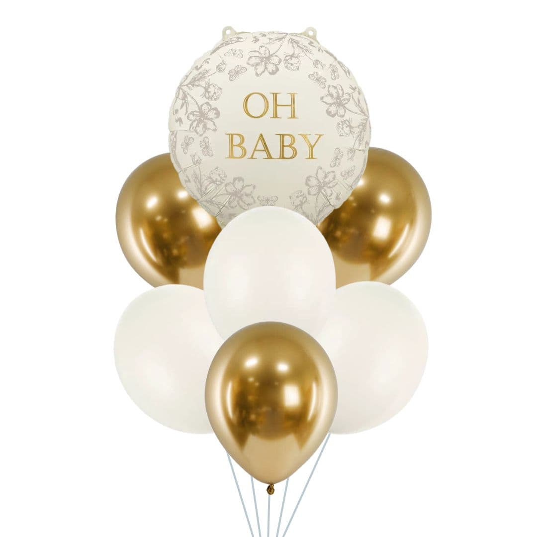 Zestaw balonów „Oh Baby” w odcieniach beżu i złota to gotowa dekoracja, która rozświetli każde baby shower. Łączy elegancję i urok w subtelnej, stylowej formie. Idealnie sprawdza się nad stołem, przy ściance lub jako ozdoba tła do zdjęć. Z nim świętowanie maluszka nabiera wyjątkowego charakteru!