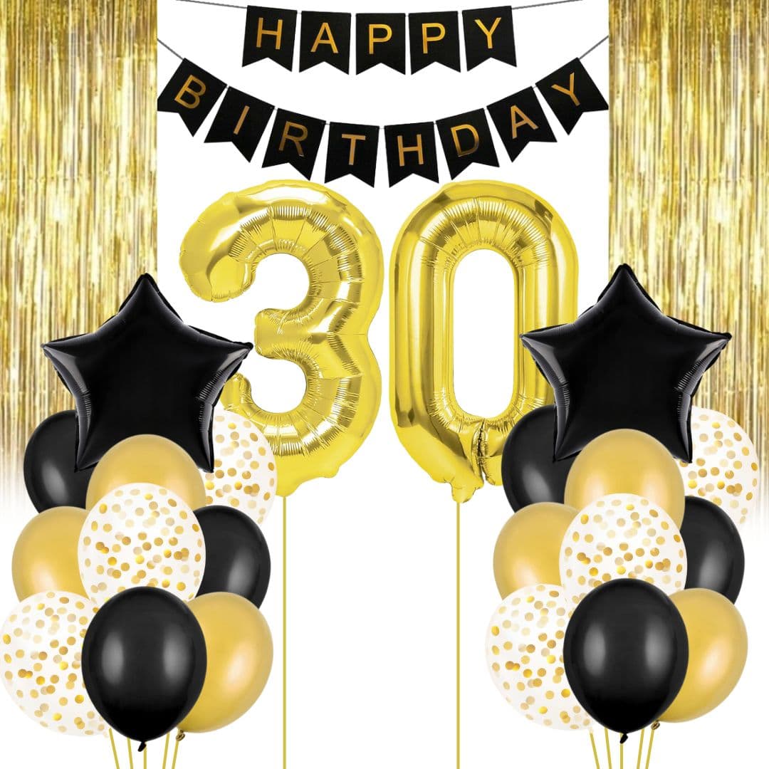 Złoty zestaw balonowy na 30 urodziny zawiera: