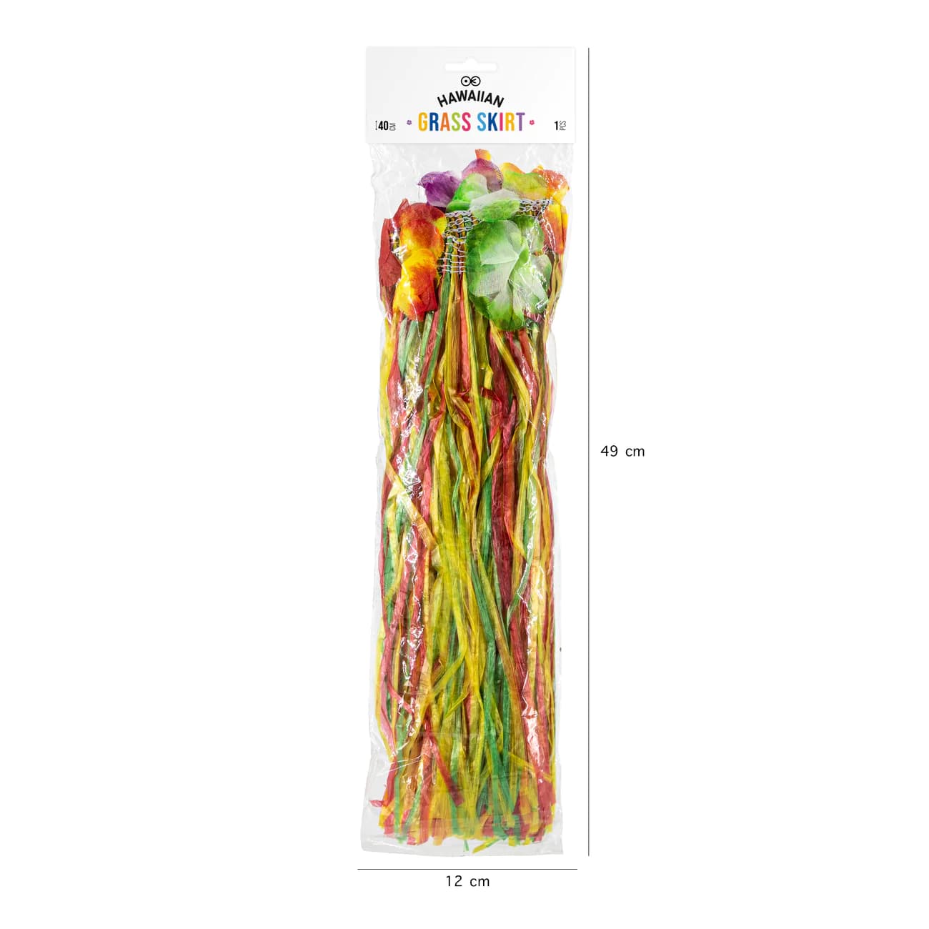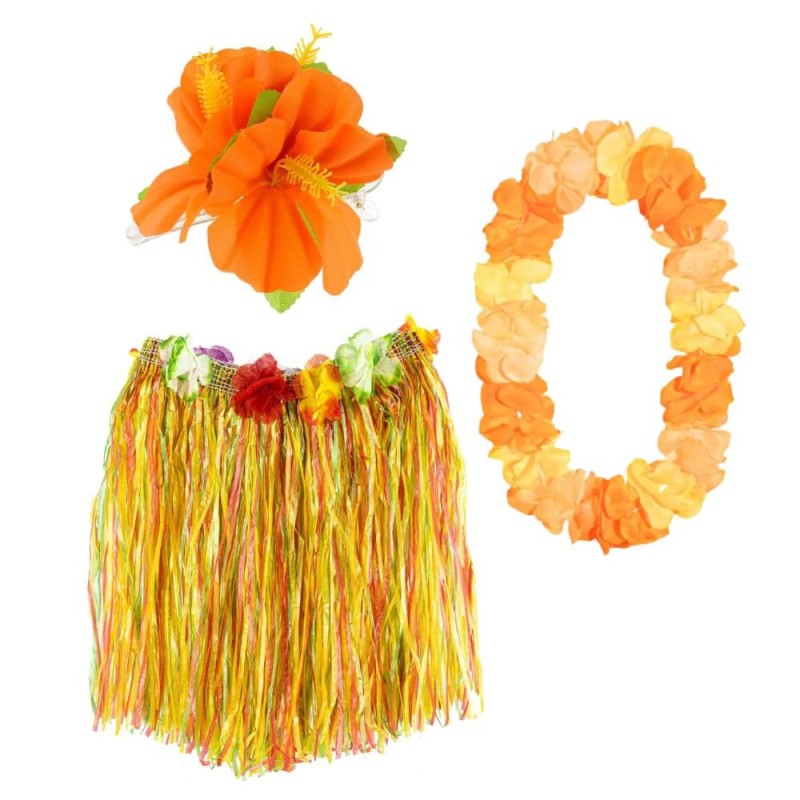 Zestaw hawajski do przebrania w kolorze pomarańczowym posiada w komplecie spódniczkę, naszyjnik oraz spinkę. Rozmiar jest uniwersalny dla dorosłych.