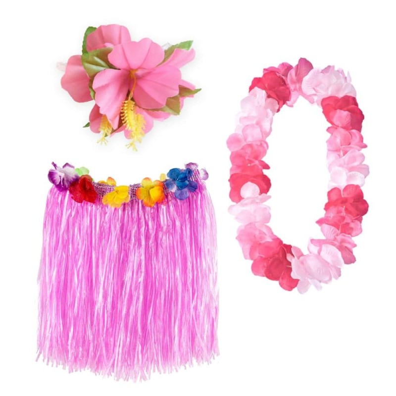 Zestaw hawajski do przebrania w kolorze różowym posiada w komplecie spódniczkę, naszyjnik oraz spinkę. Rozmiar jest uniwersalny dla dorosłych.