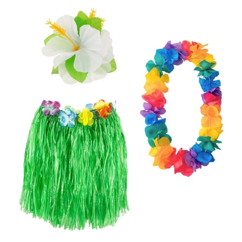 Zielony jak dżungla i pełen pozytywnej energii – ten hawajski zestaw rozkręci każdą imprezę! W komplecie spódniczka, naszyjnik i spinka z kwiatkiem – wszystko, czego potrzeba do tropikalnej metamorfozy. Doskonały wybór na imprezy plenerowe i szalone przebieranki. Uwaga: wywołuje uśmiech i chęć tańca.