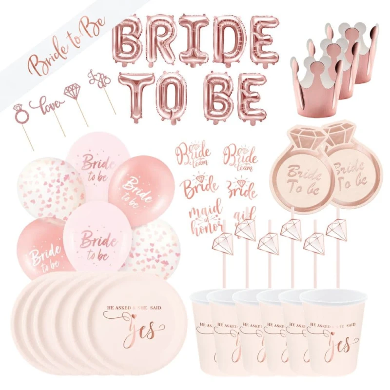 Zestaw "She said YES!" to idealny wybór na wieczory panieńskie. Zawiera wszystkie niezbędne pozycje do świetnej zabawy. Został stworzony w bardzo modnym kolorze rose gold. Gwarantujemy, że przyszła panna młoda będzie ogromnie zadowolona z takiej aranżacji.